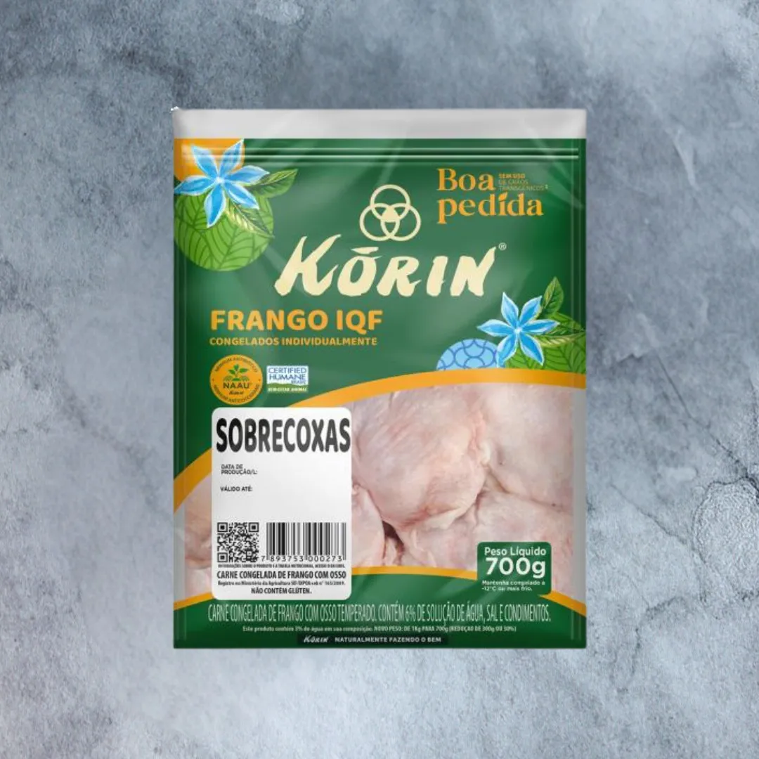 A Sobrecoxa Korin é perfeita para diversas receitas, oferecendo um frango mais saudável, criado sem antibióticos e com todo o cuidado que a marca Korin garante. Ideal para quem busca praticidade sem abrir mão da qualidade na alimentação da família.